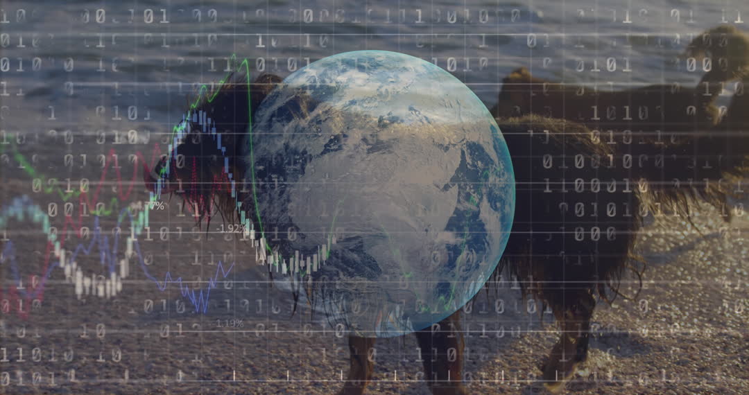 Illustrates intersection of nature and technology, featuring planet Earth, binary data, and dogs on beach. Suitable for themes around global connectivity, data science, and the impact of technology on nature. Serves as an educational or informational visual in discussions about tech innovation and environmental stewardship.