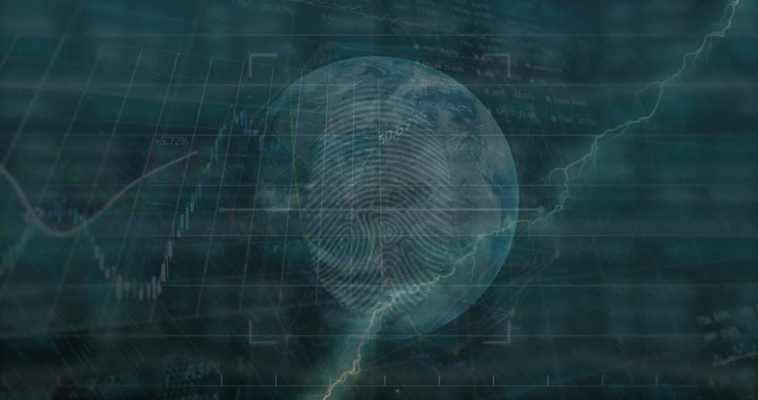 Futuristic view combining a globe and a digital fingerprint overlaid with stock charts and data. Suitable for illustrating concepts in cybersecurity, digital commerce, or globalization. Ideal for use in technology, finance, or business presentations to convey modern data and network ideas.