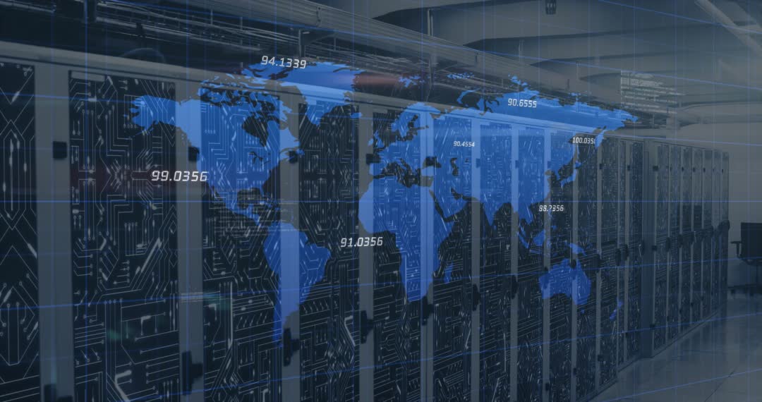 This visual illustrates advanced global data management with a digital map overlay on server racks, highlighting efficient technologies in information technology infrastructure. It represents the intersection between physical data centers and globally interconnected network systems. Ideal for use in IT presentations, cybersecurity awareness, data analytics strategies, or showcasing modern computing infrastructure advancements.