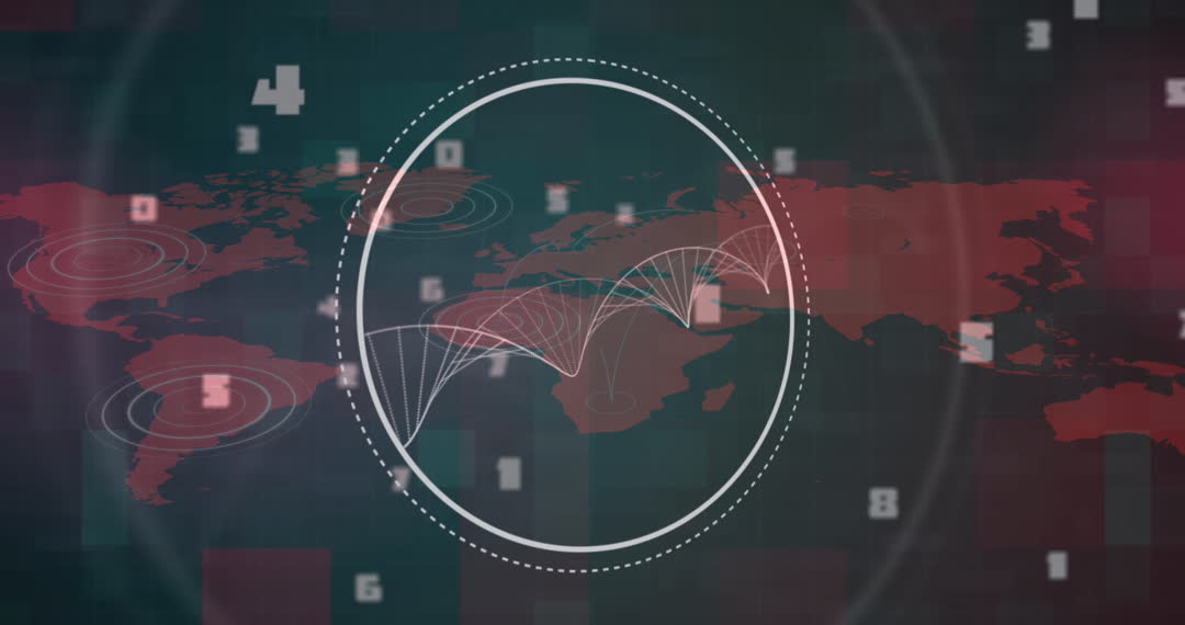 Visual representation of global data networks and DNA interconnections overlays with animated elements of computing and numbers. Useful for presentations, educational materials, or digital media projects on genetics, big data, or global technological advancements.