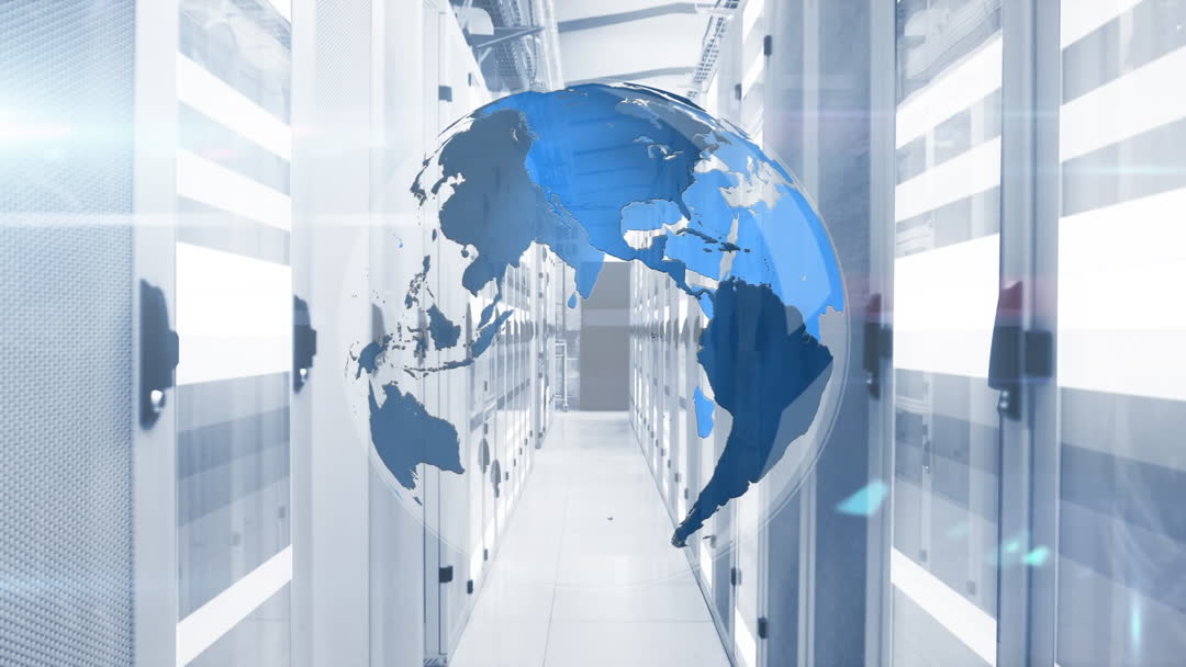 This visual represents the concept of global data management with a globe overlay in a secure server room. It symbolizes international digital connectivity, making it suitable for use in content about cloud computing, international data networks, IT security, and advancements in digital communication.