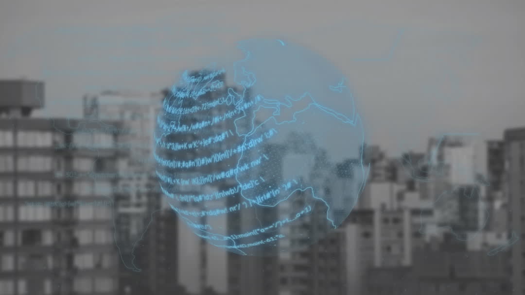 The video shows a digital globe overlaying an urban skyline, representing the interconnectedness of data networks globally. Ideal for use in technology blogs, business reports, cybersecurity presentations, and articles about urban development and globalization. This blend of virtual data interfaces with real city elements highlights advancements in global finance and communications technology.