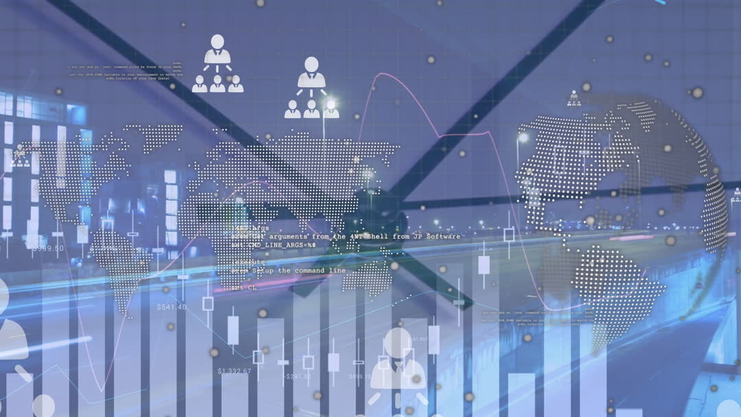 This animation blends videos of a digital world map, graphics, and data elements over a nighttime cityscape. The design is ideal for illustrating global communication, data processing, and technological infrastructure. Useful as a visual aid in business presentations, marketing materials, or technology-themed content.