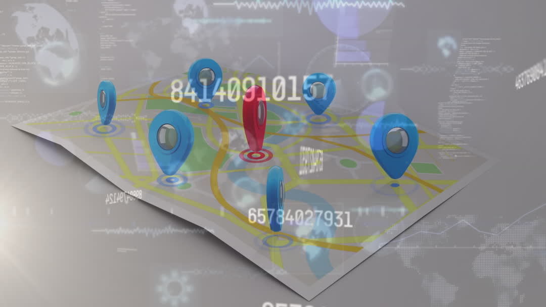 This digital representation shows a dynamic map overlaid with data processing elements and blue and red location markers. It is symbolic of global data networks and geographic information systems showcasing connectivity and technological advancements. Use in presentations on global commerce, technology and network connections, or information science.