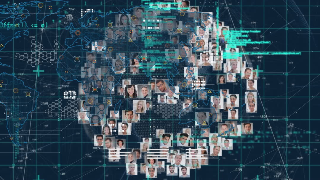 Concept visual illustrating global data processing demonstrates interconnected digital networks with diverse professional headshots symbolizing connectivity among individuals. Ideal for use in presentations on networking technology, communication, and globalization in a modern, digital environment.