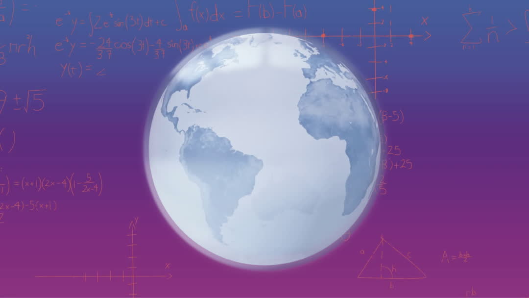 This visual represents the concept of global data connections and communication processes across a digital network. The surrounding data and equations emphasize business intelligence and computing technology. Suitable for illustrating themes of technological advancement, global commerce, and analytical innovation in digital platforms, and for use in presentations or international business features.