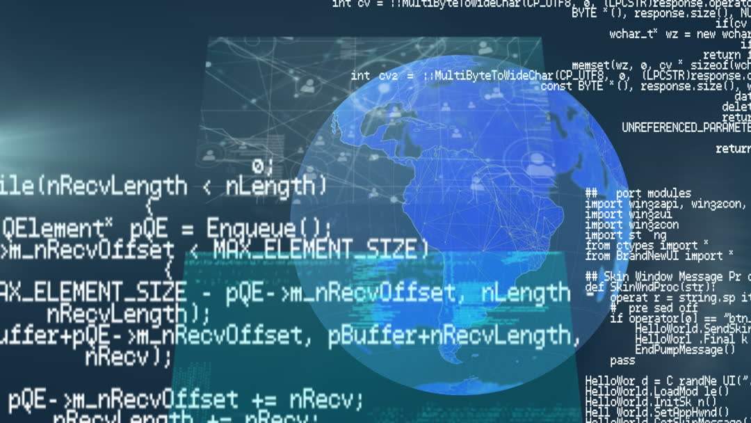 Visual representation of digital data processing and technology with overlapping codes and a globe, emphasizing connectivity and global computing. Useful for illustrating concepts of networking, technology advancement, or data management in presentations, educational materials, and technology-related projects.