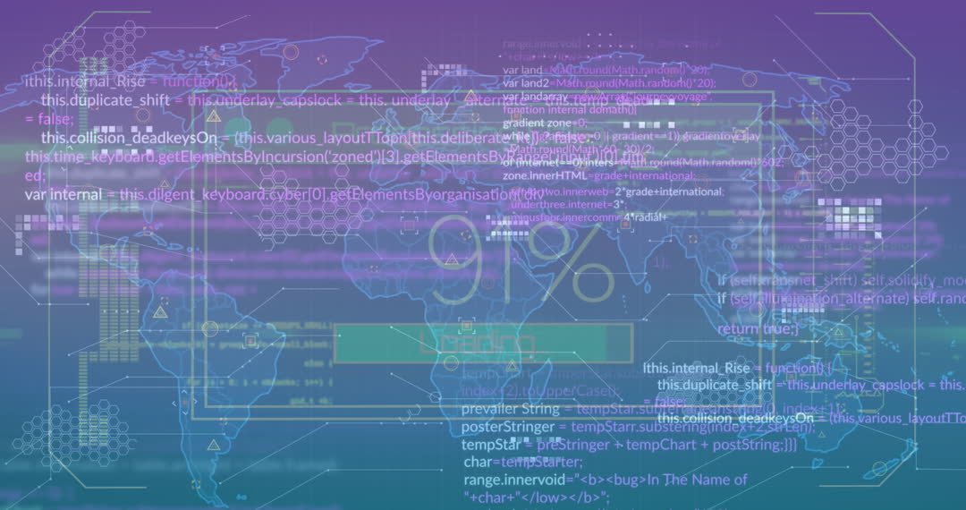 The digital animation features a dynamic computer interface with complex data processing overlays placed on a world map, emphasized by a gradient background. It captures the essence of global digital networks and information flow. Useful in presentations or articles about technology advancement, global communication, digital databases, and future tech trends.