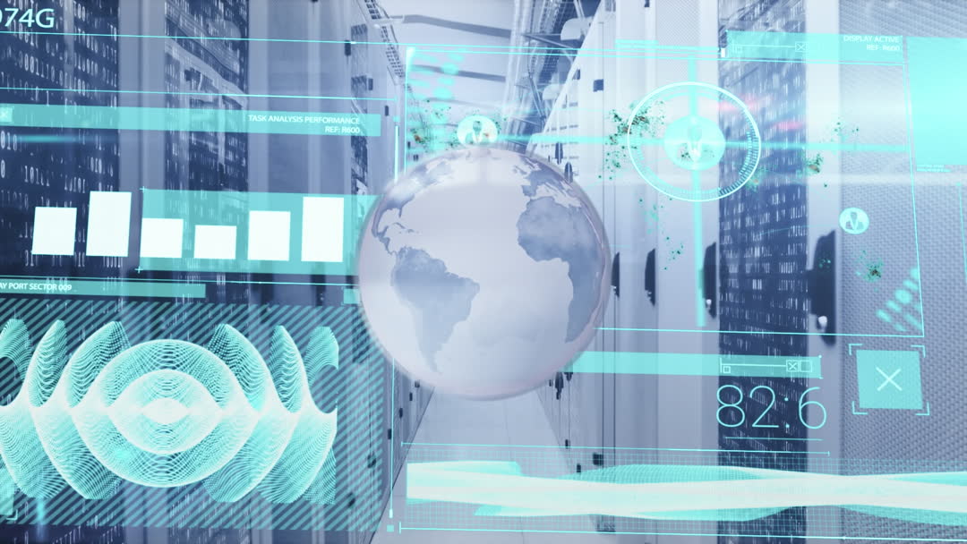 Animation features global data processing overlaid on a modern server room, symbolizing advanced technology and digital networks. Visualizes concepts of global connectivity, efficient data management, and technological advancements. Useful for illustrating themes in business, technology enhancements, and digital infrastructure innovation in presentations or publications.