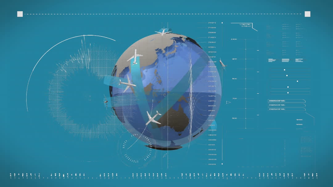 This vibrant depiction of global data processing features dynamic elements, providing a visual representation of digital networks in a high-tech world. Airplanes flying over a world map symbolize global communication and interconnectedness. Ideal for illustrating technology articles, digital communication themes, telecom services, or educational materials about data networking and globalization.