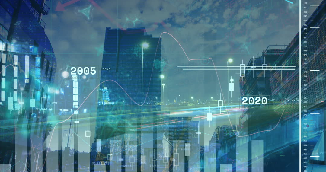 Visual of data overlays on a cityscape, illustrating themes of global business and technological advancements. Useful for presentations on data analytics, urban technology development, and economic trends. Ideal for marketing materials in technology and financial sectors.