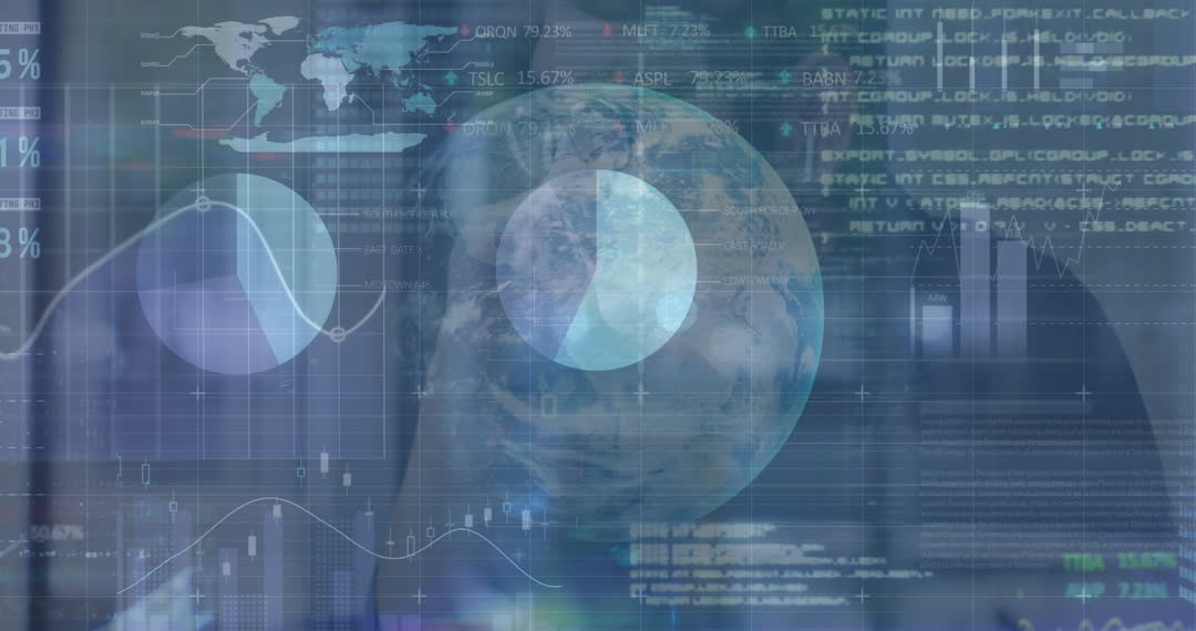 Visual offers a dynamic portrayal of global data processing with earth videory and financial charts. Blue thematic tones evoke a sense of technology and global economy. Suitable for presentations, articles, or media related to business technology, global finance, or digital economic themes.