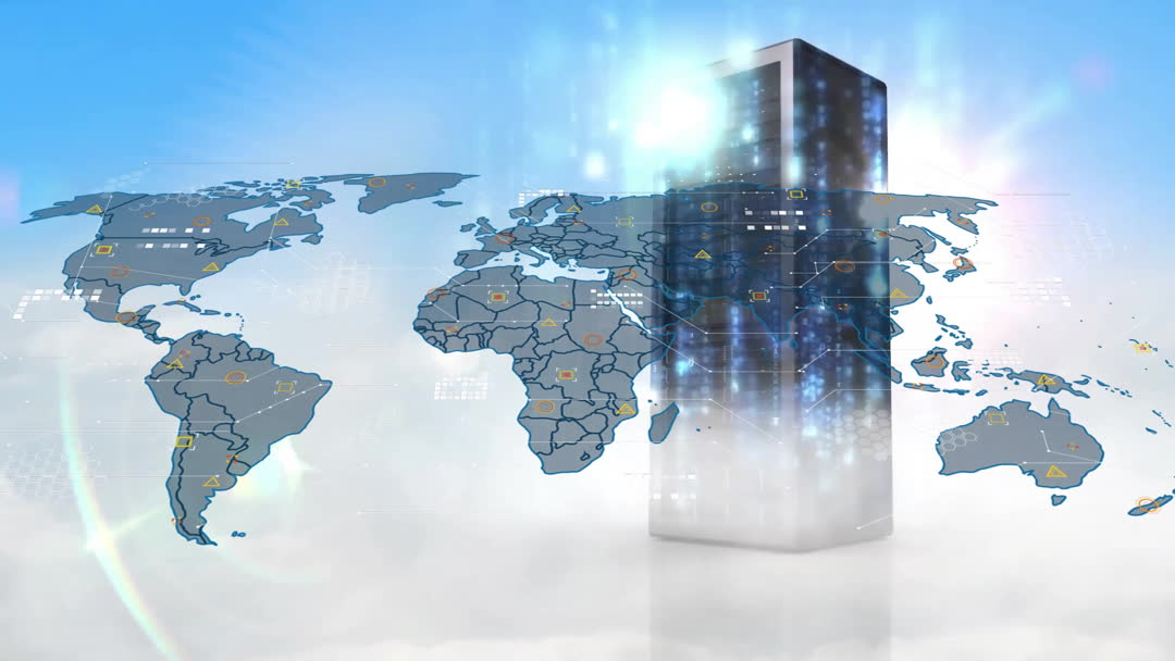 The video illustrates the concept of global data processing with a server visualized behind a digital world map. This highlights the interconnectedness of technology and business across different geographical regions. An ideal visual for presenting technology solutions, showcasing global business impact, or illustrating themes related to cloud computing and digital transformation.