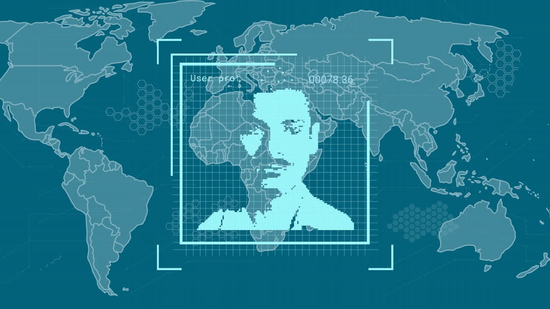 Innovative design showcasing digital processing of personal data with a portrait overlay on a world map. Can be used in articles, presentations, and advertisements related to cyber security, global technology advancements, AI developments, and digital identity verification. Appeals to audiences interested in high-tech trends and futuristic concepts.