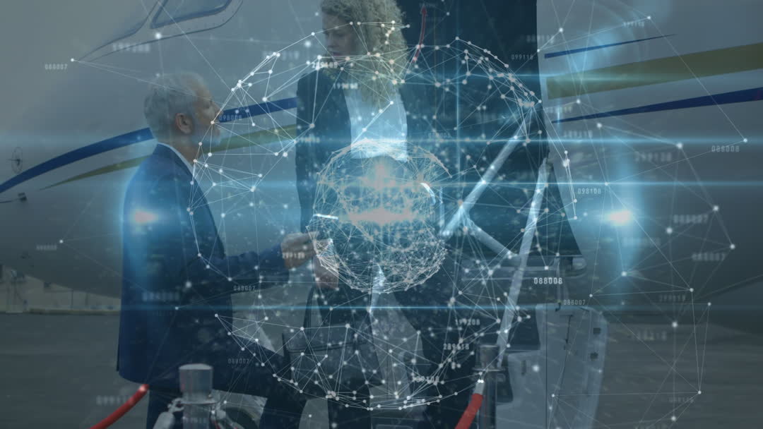 Caucasian business professionals engage in a conversation outside jet with digital data overlay depicting global data processing. This visual represents technology integration in global business and collaborative networking. Suitable for illustrating modern business concepts, innovation and technological advancements in marketing materials and corporate presentations.