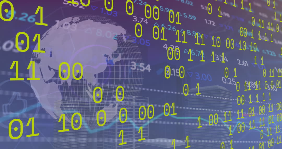 Visual depicts interaction of flowing binary code with a virtual globe and financial charts. Suitable for use in tech-focused marketing materials, financial services promotions, or digital presentations highlighting data analytics, global finance, or technological advancements.