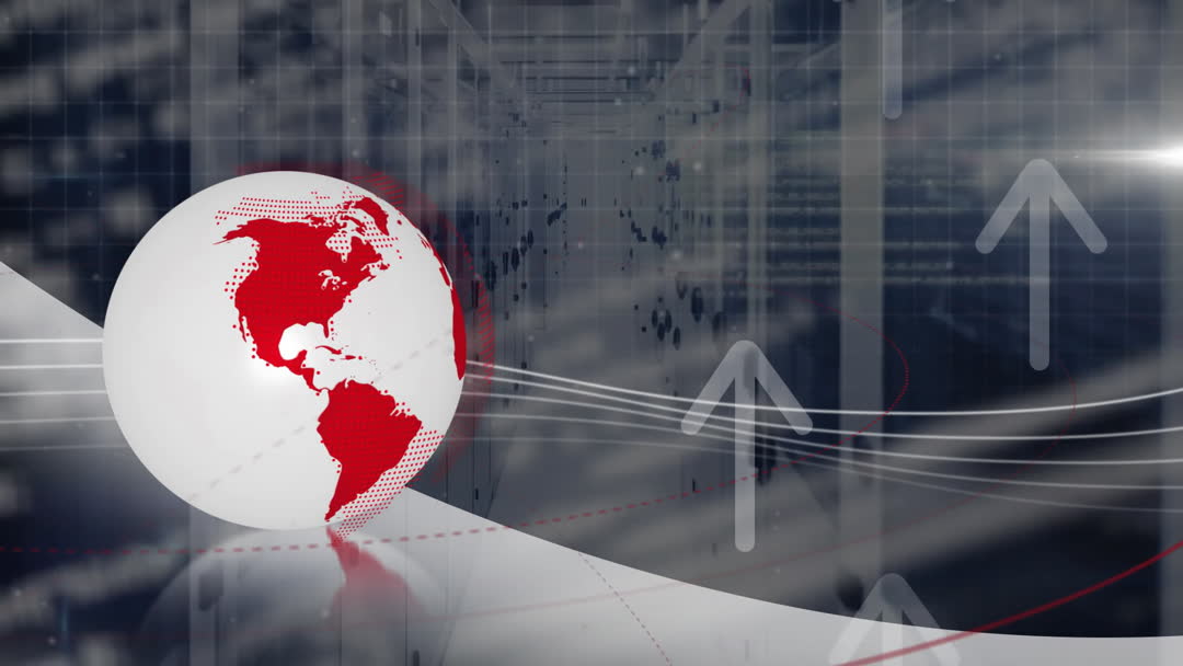 Visual depicts digital animation featuring a globe and abstract data flowing, symbolizing global data processing within computer servers. Ideal for illustrating subjects related to global business, digital finance, and data connectivity in presentations or educational materials.