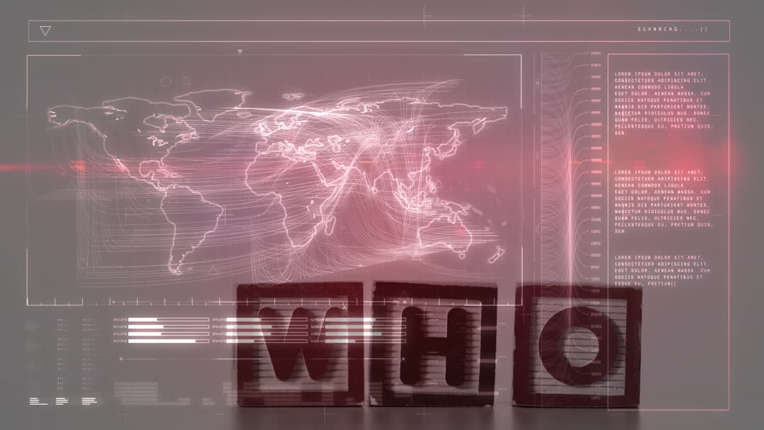 Features digital representation of data processing over world map, symbolizing global data analysis and security trends. Blocks spelling 'WHO' add element of curiosity and thematic focus on authority or questions related to World Health. Useful for illustrating concepts of digital transformation, global health, security policies, or educational materials focusing on international organizations and technology.
