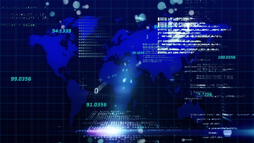 Illustrating the concept of digitalization, the video shows a digital interface overlaying a world map with binary coding and numerical data. This visual representation can be used to discuss global data processing, cyber security advancements, or technological evolution.