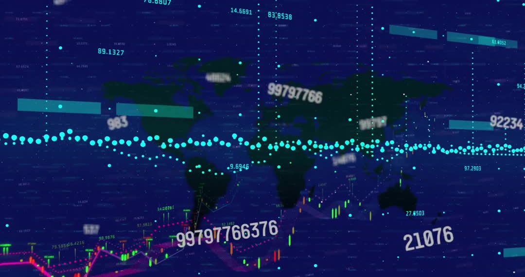 Animated representation of global data processing with an integrated world map is depicting financial patterns and trends. Constant flow of numbers suggests live data capabilities, making it ideal for presentation media, financial analysis demonstrations, or educational tools showcasing global market dynamics.