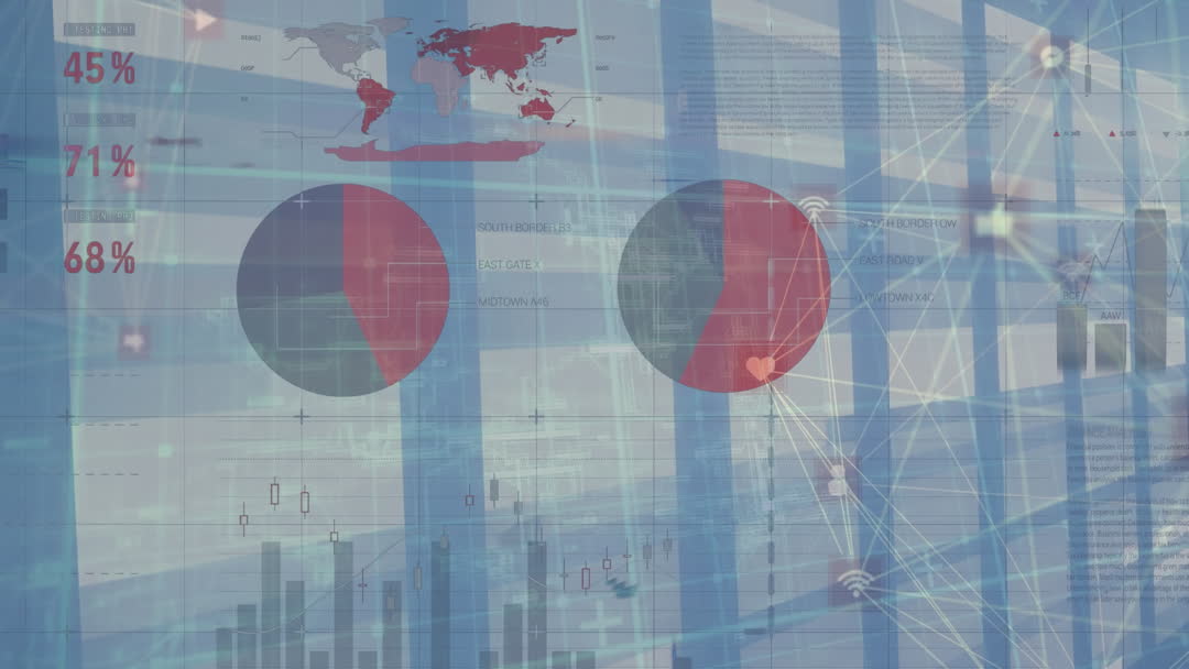 This visualization of global data technology and networking merges a dynamic digital interface with data analytics and server room elements. Useful for presentations on digital transformation, business analytics, global connectivity and modern server technology innovation.