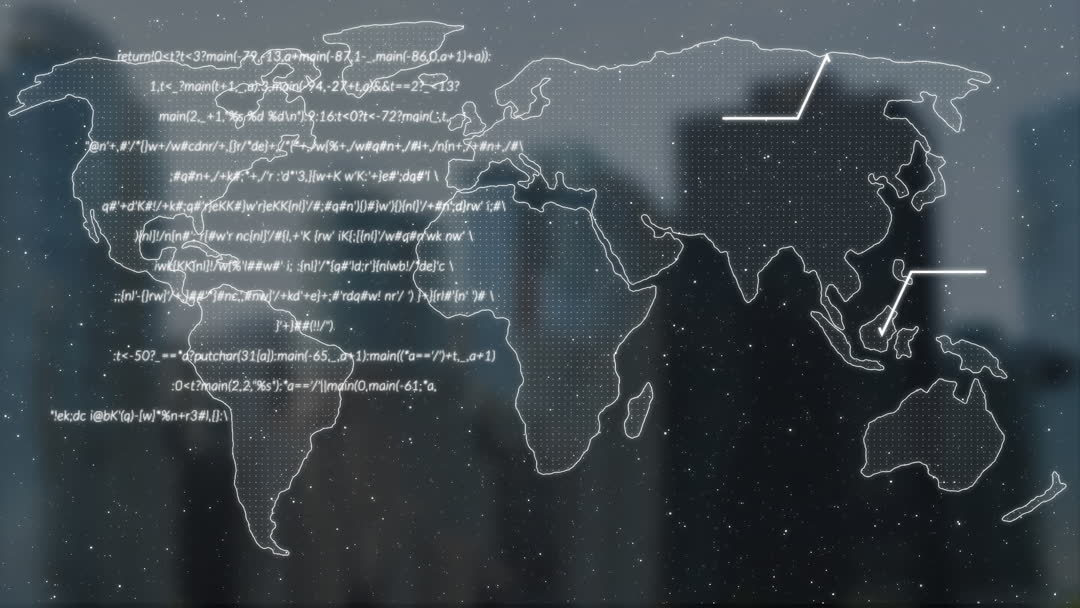 Abstract animation depicts digital data movement across global map with flowing programming code and points of light. Ideal for technology presentations, data and coding services, or instructional video backgrounds showcasing global network connections and digital information flow.