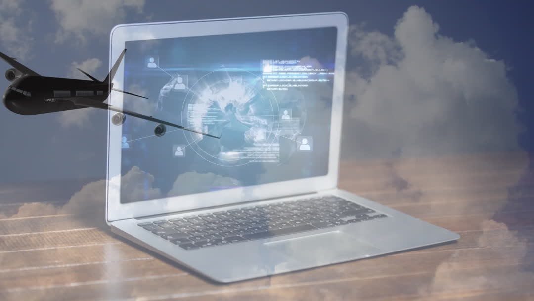 - Global Data Transfer Streaming on a Laptop Screen with Air Travel Overlay