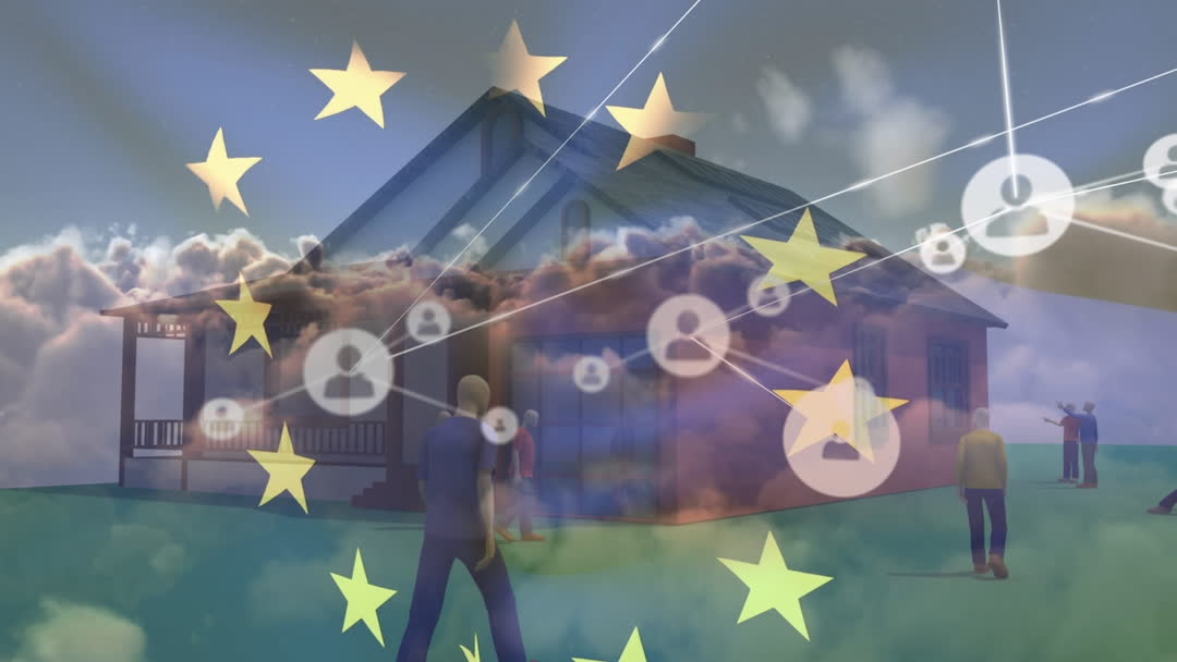 Visually represents a global network concept with digital interfaces overlaid onto a house and animated icons. This video can be used in presentations on digital technology, global communication, remote work solutions, and community networking platforms, highlighting concepts like connectivity and digital integration among diverse individuals.