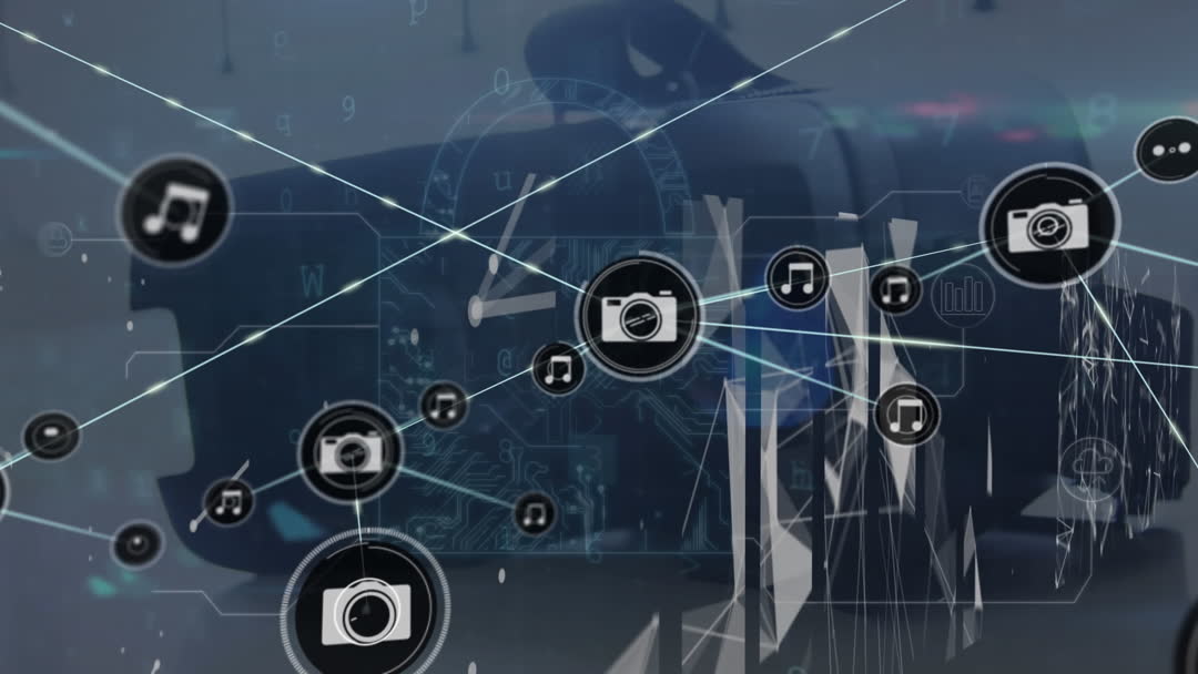 Animation depicts global digital connections with music and camera icons interlinked, symbolizing interconnectedness in digital technology. Perfect for illustrating concepts of smart technology, advanced interfaces, and global communications in digital marketing materials, presentations, and educational content.