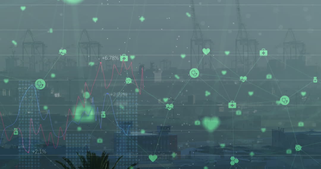 Visual representation of digital connectivity and global growth patterns over an urban industrial background. Overlay of graphs and network symbols indicate digital transformation in industry and finance. Suitable for illustrating technological advancements, data analysis processes, or global business strategies. Ideal for use in presentations, blogs, or media about modern technology or industry.