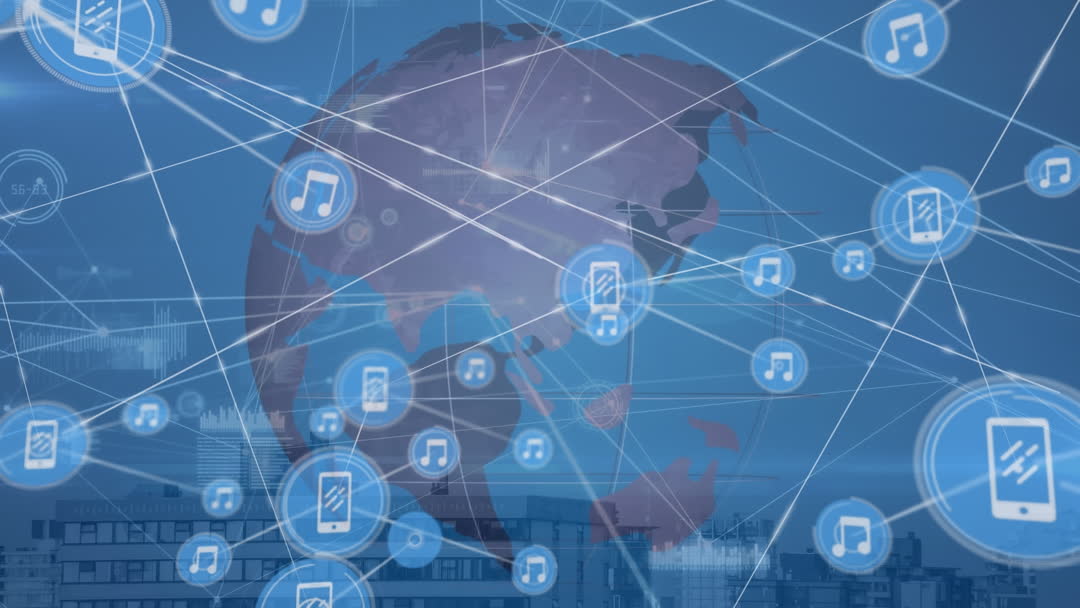 This video displays interconnected devices and music icons overlaying a digital representation of the globe, suggesting worldwide communication and digital media access. It is ideal for illustrating concepts related to music streaming services, globalization, technological advancement, and the internet of things. Suitable for use in presentations, articles, or marketing for technology and communication fields.