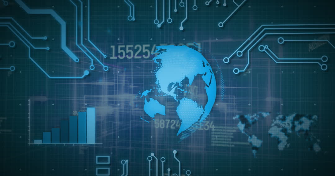 This illustration features a digital rendering of a globe surrounded by electronic circuit patterns and data graphics. It is ideal for use in technology presentations, depicting themes of global digitalization and data connectivity. The blue tones give a futuristic touch stylishly representing data processing.