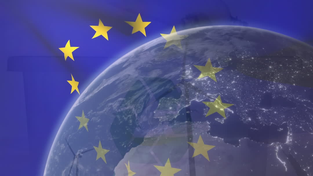 This concept visually represents a digital network spanning the globe, highlighting connectivity and data exchange across continents, marked by the iconic European Union stars. Ideal for illustrating themes related to international business, globalization, technology, and global communication. Suitable for digital showcases, business presentations, and educational materials on global networks.