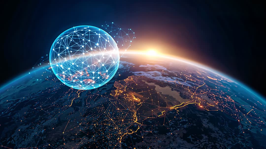 AI Generated Image. Visual showing holographic blue sphere built from interconnected glowing nodes and lines hovering above Earth at sunrise, with city lights and neon network trails mapping global connectivity. Bright sunrise appearing on horizon, casting warm rim light on planetary curvature and contrasting with cool cyan net overlay. Network nodes pulsing and trails linking urban clusters while transparent grid and particle sparks forming around sphere. Composition offering strong diagonal flow and open space on right for text or logo placement. Working well for technology and telecom video intros, corporate presentations, data visualization animations, cybersecurity reports, AI and IoT marketing, educational clips on global networks, website hero banners, social media campaign backgrounds, and print covers for tech publications. Motion-friendly frame for animated reveals and lower-third overlays, color palette supporting split-tone grading between warm sunrise and cool cyan highlights.
