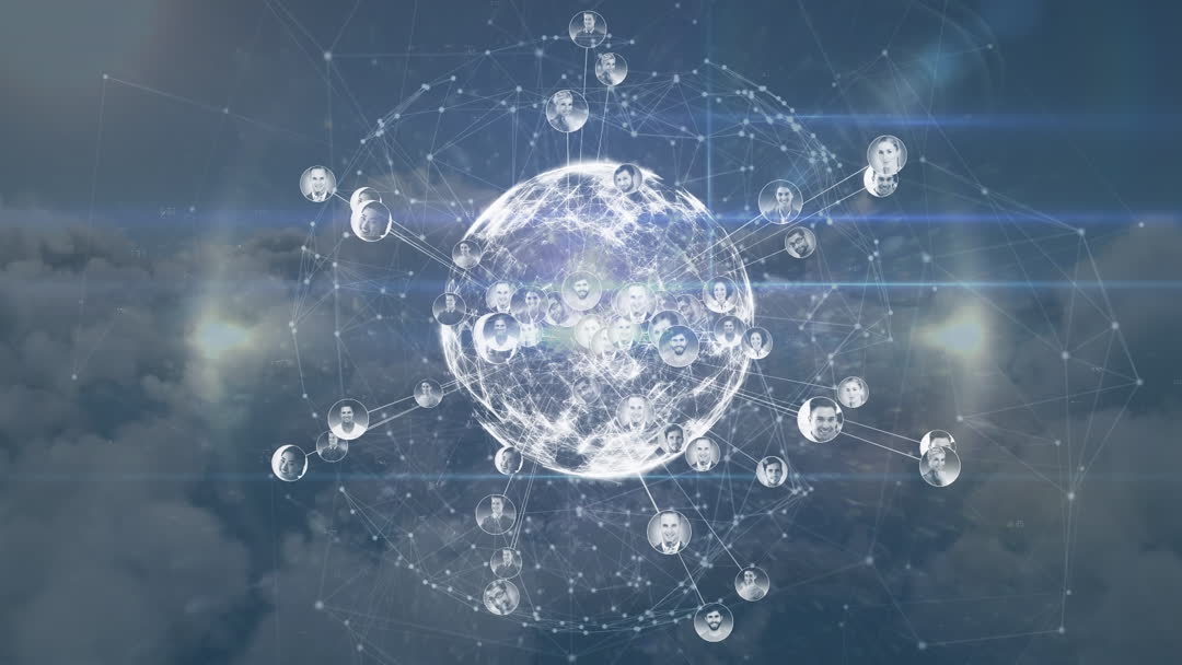 This video illustrates a digital global network where individual connections are represented by people's photos linked around a globe. Useful for showcasing concepts of global communication and interconnected digital networks in presentations or articles about cloud computing, online networking, and modern technology infrastructure.