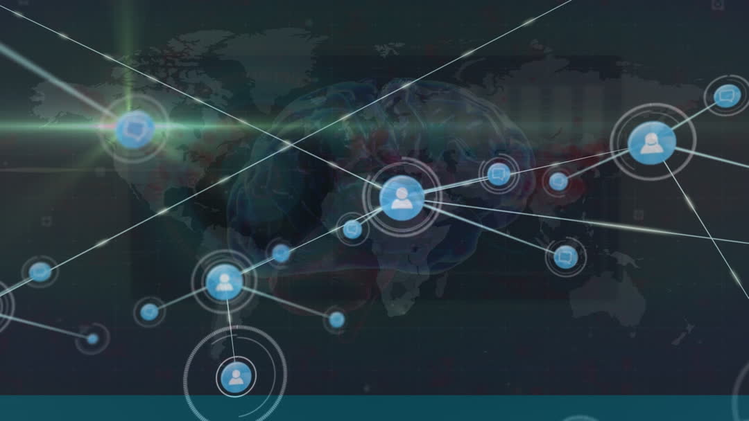 Illuminating the concept of worldwide connectivity, this visualization features icons symbolizing profile connections intersecting across a digital brain and backdrop of a world map. The artwork explores technological advances in digital communications and networking. This videory is applicable for technology-driven publications, global connectivity narratives, illustrations in data exchange concepts, and exemplifying advancements in interconnected digital systems.