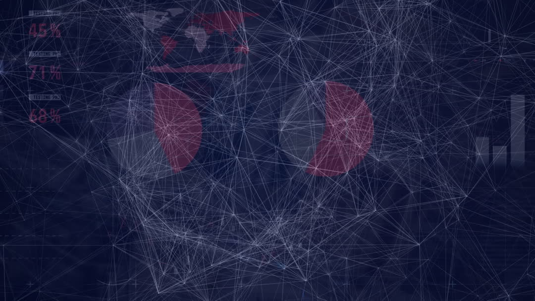 Visual representing digital network connections overlaying data analytics. The visualization of lines and pie charts conveys concepts of global business operations and technological integration. Useful for topics on smart data solutions, digital consultations, and transformative tech advantage.