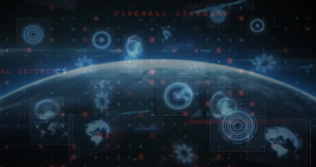 A dynamic representation of global cyber security, featuring an animated hologram overlay with numbers, symbols, and digital circuits. The text highlighting 'firewall disabled' signifies security breaches, useful in contexts discussing cybersecurity risks, network vulnerabilities, and global digital communication. Ideal for illustrating concepts in cybersecurity reports, digital workflow presentations, and technology-related media.