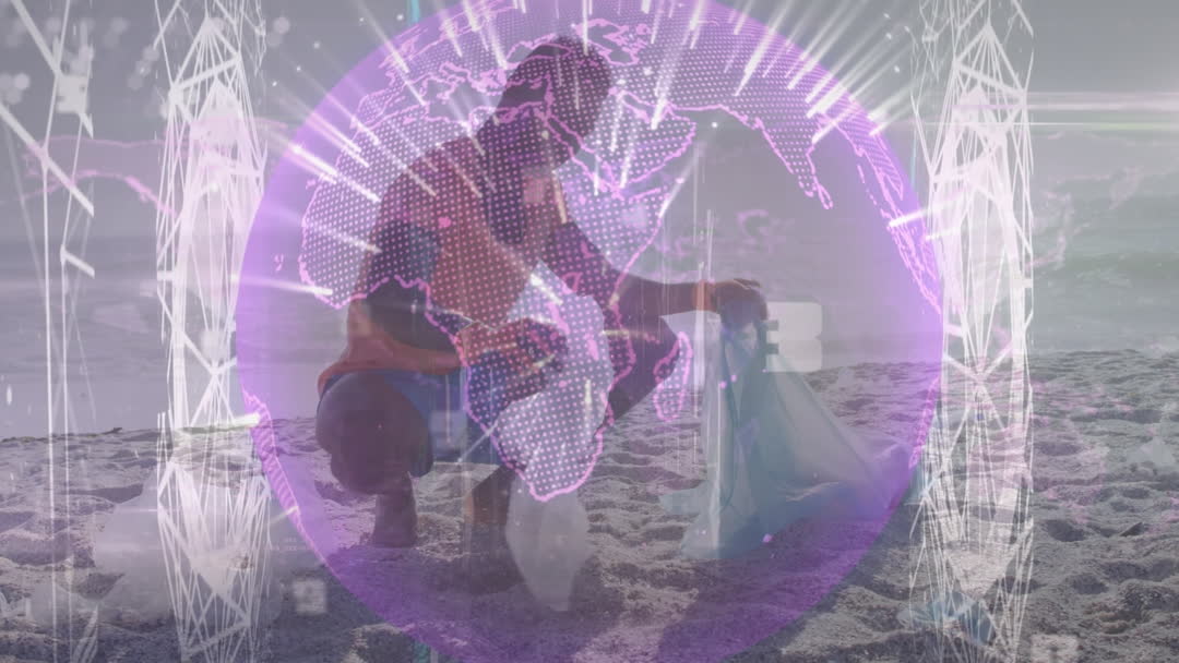 This concept video shows an animated visualization of global data processing around beach cleanup activities, symbolizing the intersection of digital technology with environmental conservation efforts. Useful for projects aimed at highlighting sustainable practices, environmental awareness campaigns, or digital technology solutions related to ecological benefits.