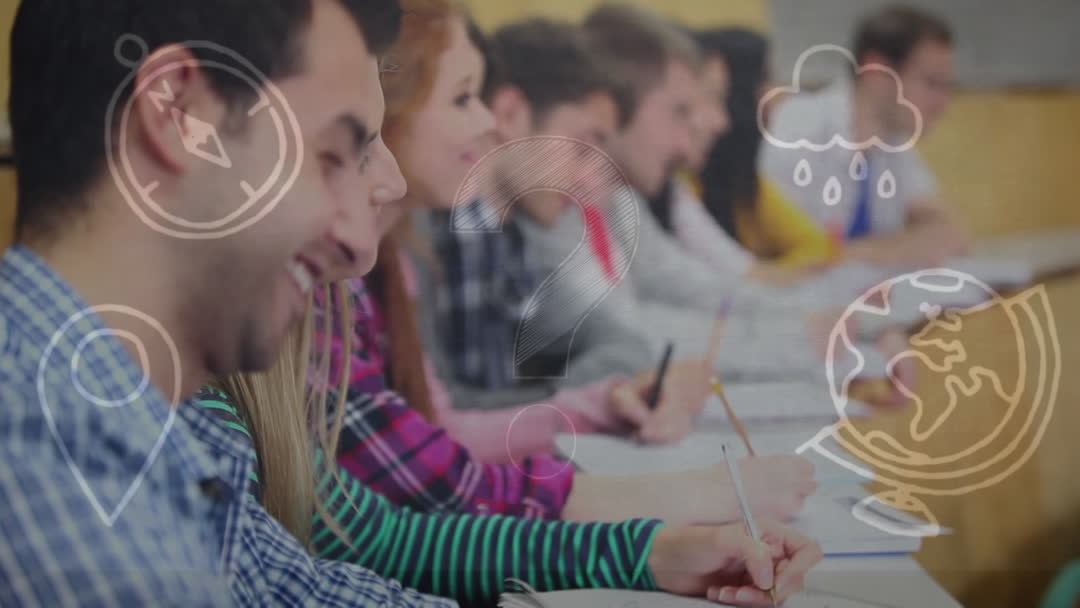 Group of diverse students studying together in a classroom setting, focusing on their tasks. Sketches of global, weather, and navigation icons overlay, symbolizing interconnected learning and global perspectives. Ideal for use in educational content, international education campaign material, or cultural exchange programs advertising.