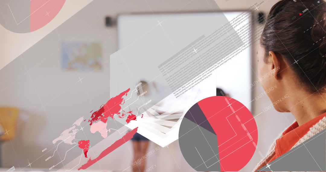 Animation features an abstract composition of digital data processing, highlighting the integration of technology in global education. Showcases a backdrop including a teacher, suggesting advancements in learning environments. Ideal for use in articles or presentations discussing modern educational technology, innovation in classrooms, or global educational trends.
