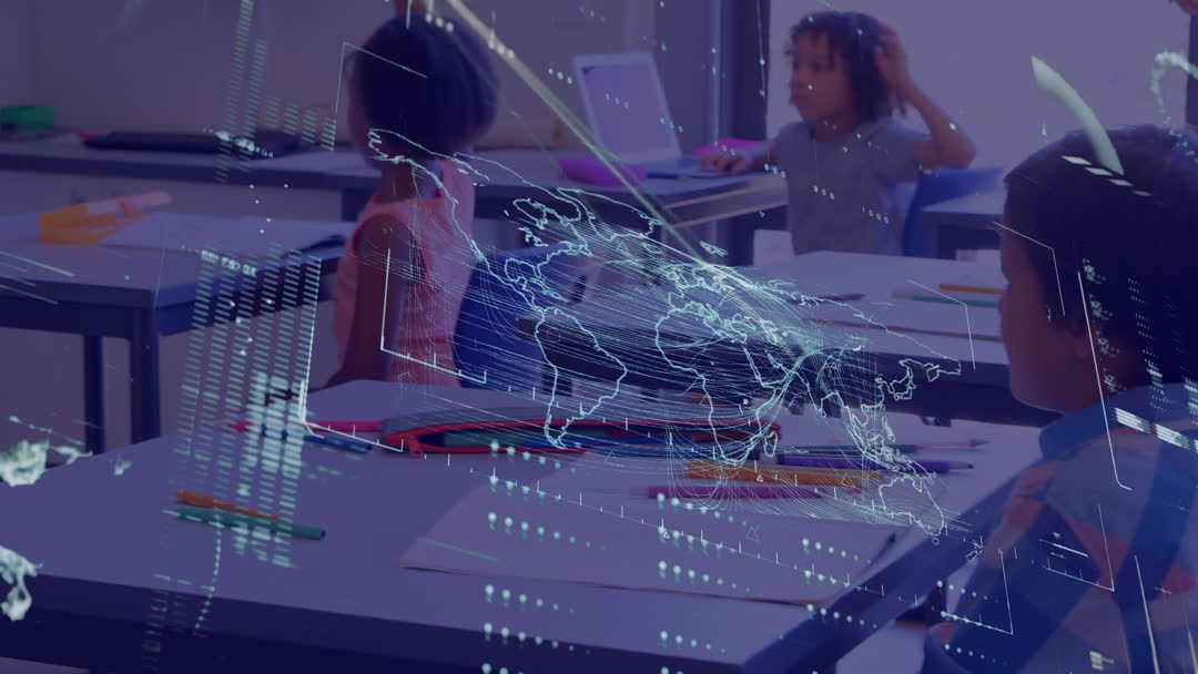 Concept of global education technology with focus on diverse classroom environment. Digital data projection intermingles with students engaging in learning. Suitable for use in educational materials, technology in education conferences, or presentations showcasing innovations in schooling systems.