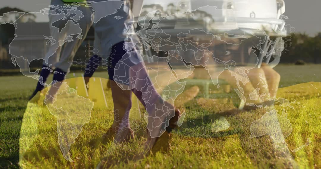 Depicting people walking on a grassy field with an overlay of a world map highlights themes of global exploration and unity. This visual representation can be used for content related to travel experiences, cultural exploration, promoting sustainability, and emphasizing the interconnectedness of diverse cultures across the world.