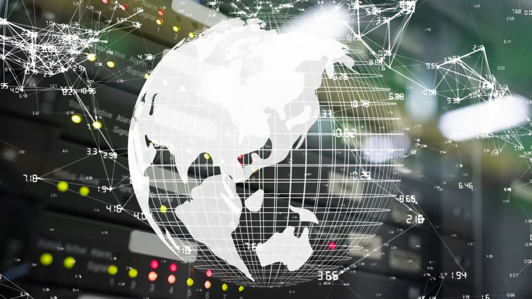 This illustration embodies a fusion of global finance and digital data processing concepts, highlighting a transparent globe against a background of computer servers. Electronic connections, statistics, and network lines symbolize robust technological and financial international connectivity. Ideal for promoting technology solutions, illustrating financial analytics, or explaining innovations in data processing.