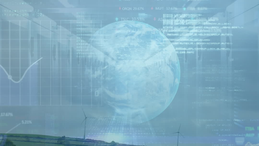 Animation portrays integration of global finance and digital technology using globe videory and stock market data graphics. Useful for presentations on finance technology, economic trends, globalization, or data analysis tech. Ideal for corporate videos, financial institution backgrounds, or tech-related events.