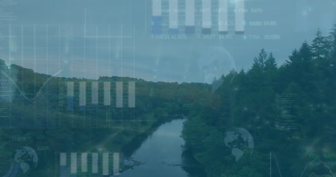 Visual merging global finance technology with serene natural landscape, exploring contrast between digital progress and environmental awareness. Ideal for discussions on financial innovation, economic analysis, technological advancements addressing sustainability.