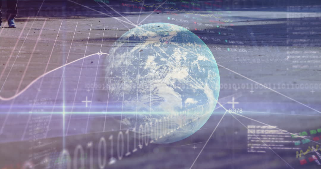 This visual combines an animation of the Earth overlaying dynamic financial data, symbolizing global interconnectedness in economy and technology. Suitable for illustrating articles, presentations, or reports on international finance, market analytics, innovations in economic technology, and global trade dynamics. Effective in emphasising global perspective in financial services marketing material.