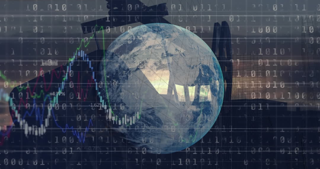 A digital composition juxtaposing a globe with financial graphics and an oil pump silhouette. Suitable for illustrating international finance topics, oil market influences, global economics research, or data-driven technology in business presentations.