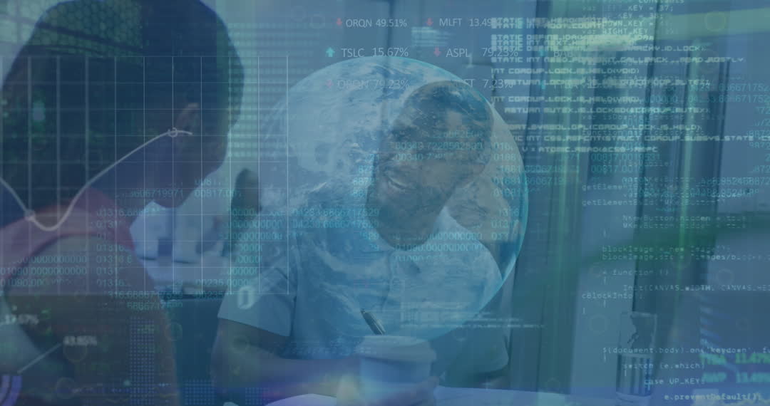 Visual blends global market data with cooperation between team members, highlighting technology's role in modern finance. Suitable for illustrating concepts of global economy, business collaboration, and technological impact on financial sectors, emphasizing diverse teamwork.