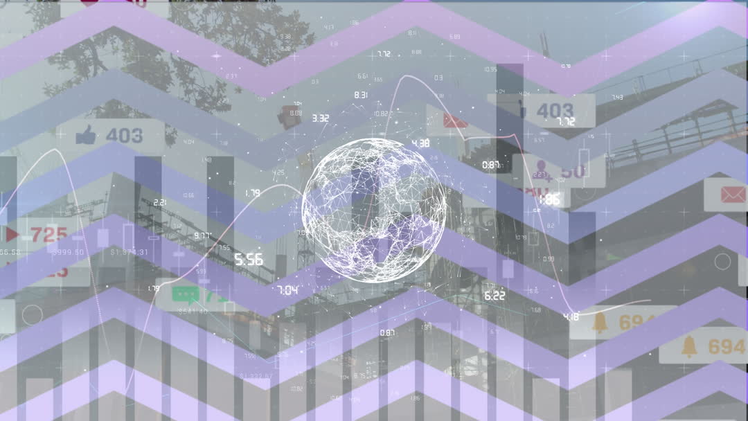 Visualizes interplay of technology and global finance with a digital globe and data graphs overlaid on a construction background. Useful for illustrating cybersecurity in finance, technological advances in construction, or showcasing economic data presentations.